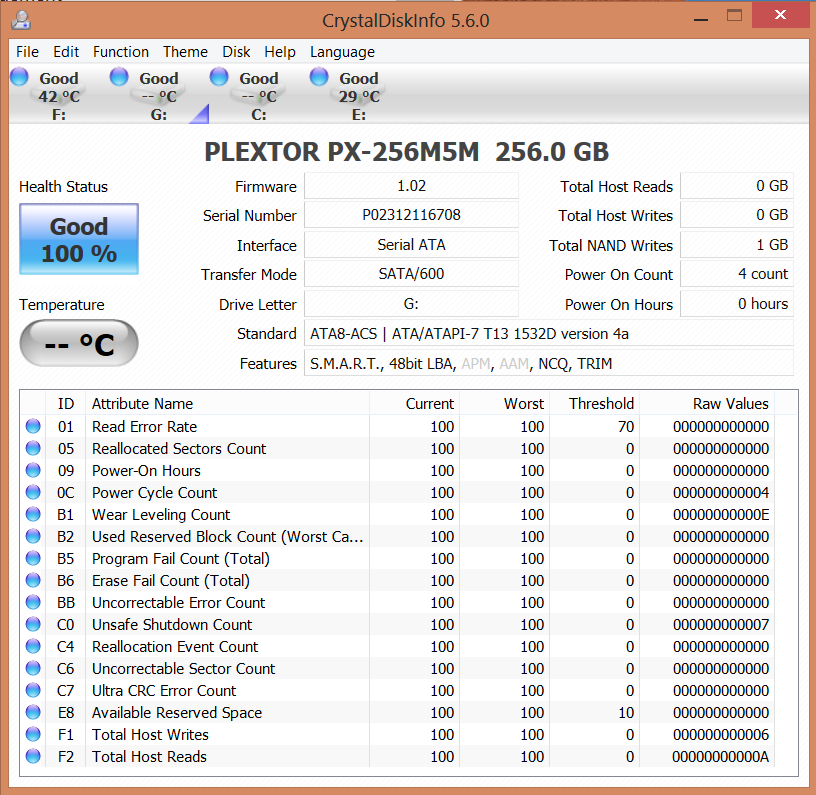 Crystal Disk Info provides some excellent information about the SSD itself to include its health, product information, ‘power on’ information as well as the characteristics of the SSD. We can see that the SSD is capable of TRIM as it is not greyed out as with AAM and APM.