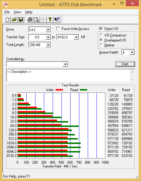 Our first benchmark ATTO reveals results that are a bit unexpected. Sequential reads max out around 720MB/s, which is quite a bit less than the rated 770MB/s. However, writes reach 580MB/s no problem. Let’s continue and see what our other benchmarks show.