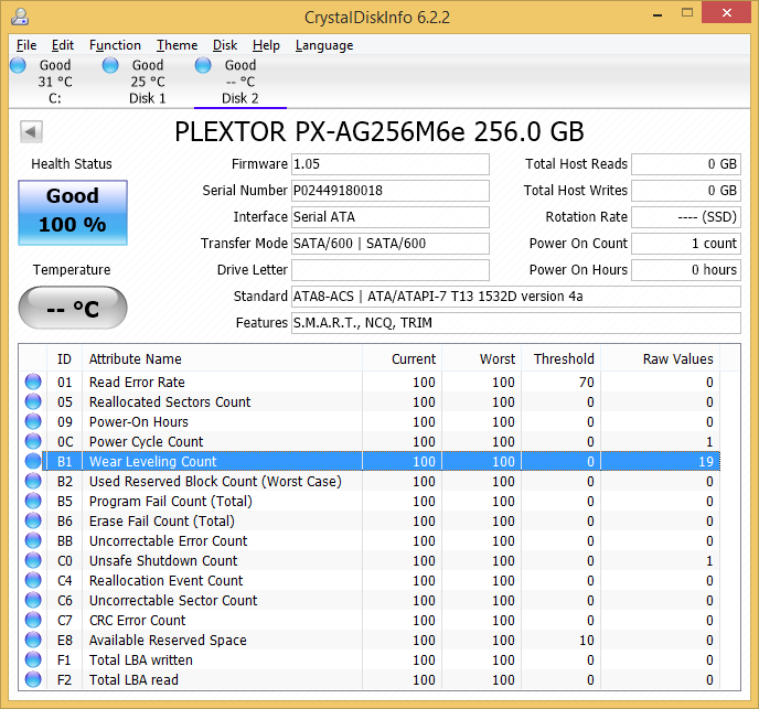 Crystal Disk Info is a great tool for displaying the characteristics and health of storage devices. It displays everything from temperatures, to the number of hours the device has been powered, and even to the extent of informing you of the firmware of the device.