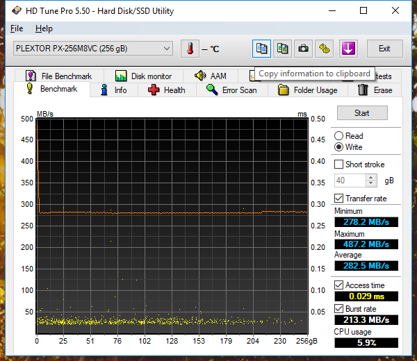 Finally, taking a look at how it performs under HDTune’s full write test, we can see that the SLC cache quickly fills. Once the cache fills, the M8V’s write performance will degrade to about 280MB/s.