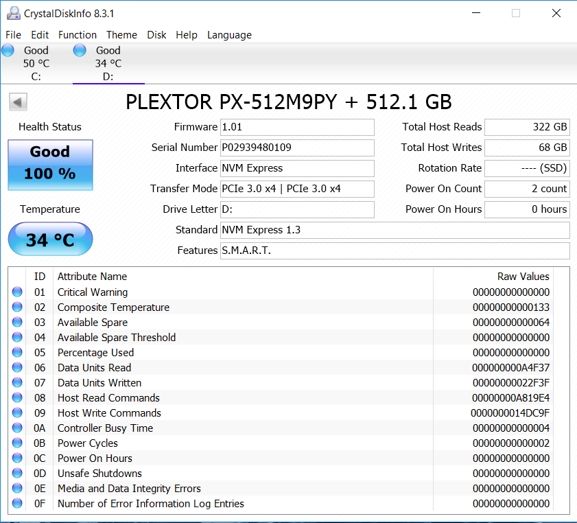 Crystal Disk Info is a great tool for displaying the characteristics and health of storage devices. It displays everything from temperatures, the number of hours the device has been powered, and even to the extent of informing you of the firmware of the device.