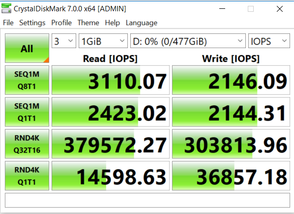 Crystal DiskMark results are fairly consistent with ATTO, at least with respect to the high sequential read and writes. What we like seeing here are the decent QD1 random 4K results, along with the 379K read IOPS in the second result.