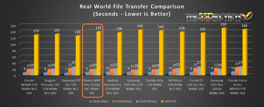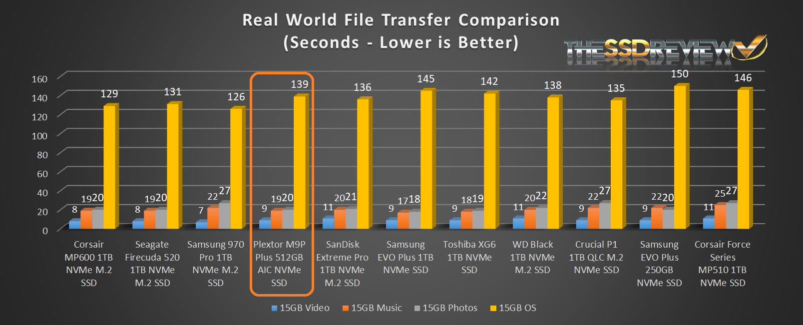 We have put the Plextor M9P Plus NVMe SSD beside the best in the business for our true to life data testing. In this test, we simply place 15GB files representing music, video, pictures and operating systems onto the target drive. We then copy each file from one place on the target disk to another, recording the time taken for the transfer.