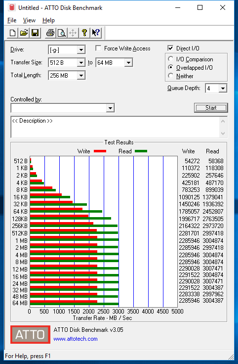 Initial results with ATTO are surprising. While this drive is rated for up to 2.75GB/s read and 1.5GB/s write, here it is demonstrating 3GB/s read and 2.3GB/s write! Don’t hold your breath though, this may be an artificially inflated result due to ATTO’s use of 100% compressible data. The controller could be utilizing some clever programming in order to achieve these results. Let’s see what our next benchmarks have to say.