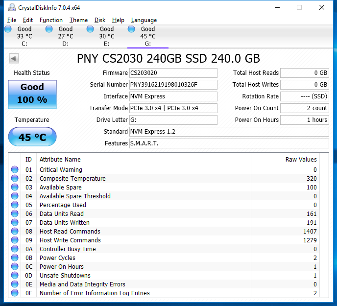 Crystal Disk Info is a great tool for displaying the characteristics and health of storage devices. It displays everything from temperatures, to the number of hours the device has been powered, and even to the extent of informing you of the firmware of the device.