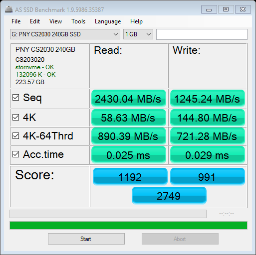 AS SSD paints a similar picture to that of Crystal Disk Mark’s. Overall, it scored 2749 points. Sequential speeds reached 2.4GB/s in read and 1.25GB/s in write. At 4K QD1 it hit an amazing 15K IOPS read! This result is actually the best we have seen for this metric in this test. The Samsung 960 Pro in comparison reached just under 14K! It also hit 227K IOPS read and 124K IOPS write in the high QD metric. Finally, in the copy benchmark, the CS2030 delivered some great results that are in line with what similar SSDs have scored.