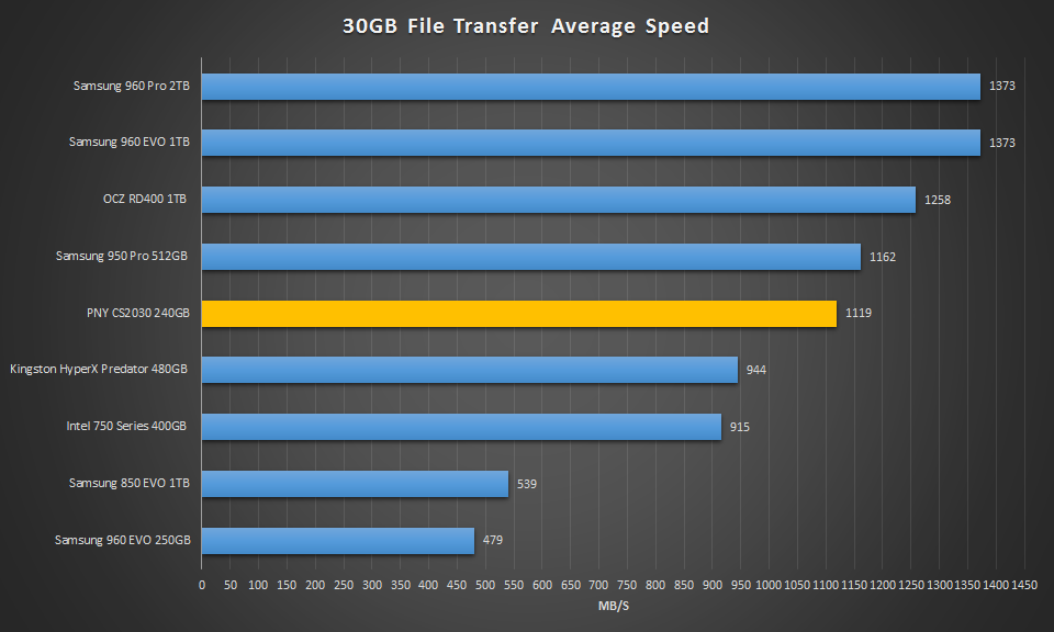 We also wanted to see how performance was in a real-world use when transferring large files to the SSD. For this test, we are going to simply stress write performance by transferring over a 30GB folder of movies off of a 512GB Samsung 950 Pro to the test SSDs and time how long it takes. Once complete we can calculate the average speed.