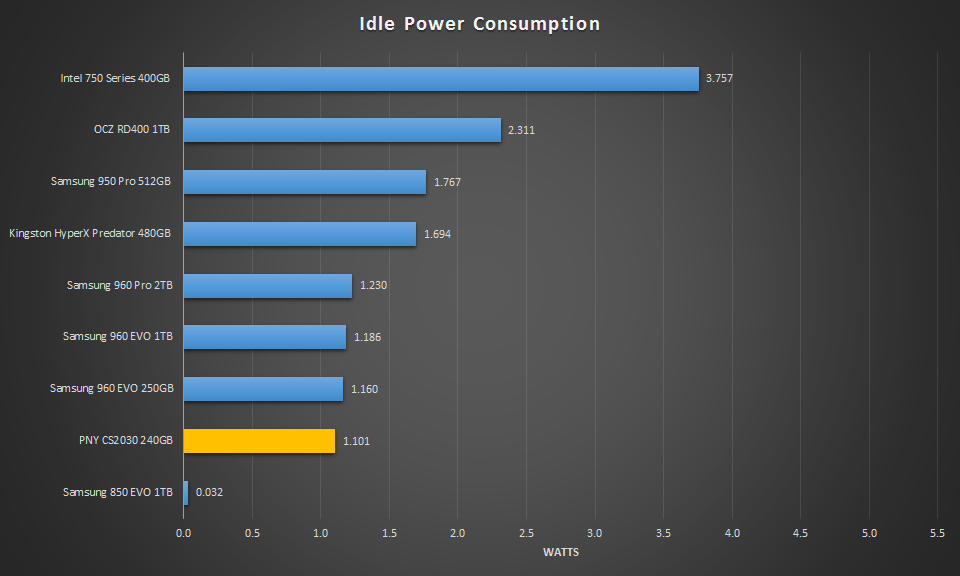 During idle, the PNY CS2030 consumes 1.1W, which is actually less power than any of the other drives in our chart. Still, this result is much higher than that of a SATA powered SSD.