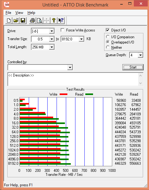 ATTO reveals some strong small file size performance as well as read and write speeds that meet spec. Sequential reads reached a high of 557MB/s as well as a high of 446MB/s for write.