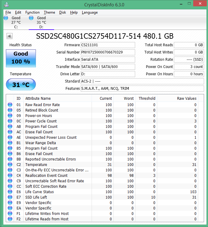 Crystal Disk Info is a great tool for displaying the characteristics and health of storage devices. It displays everything from temperatures, to the number of hours the device has been powered, and even to the extent of informing you of the firmware of the device.