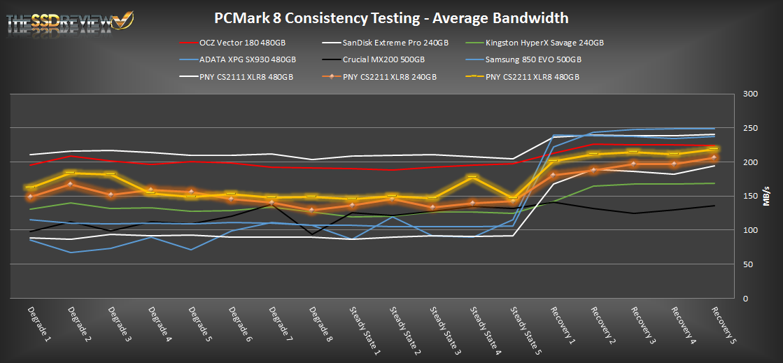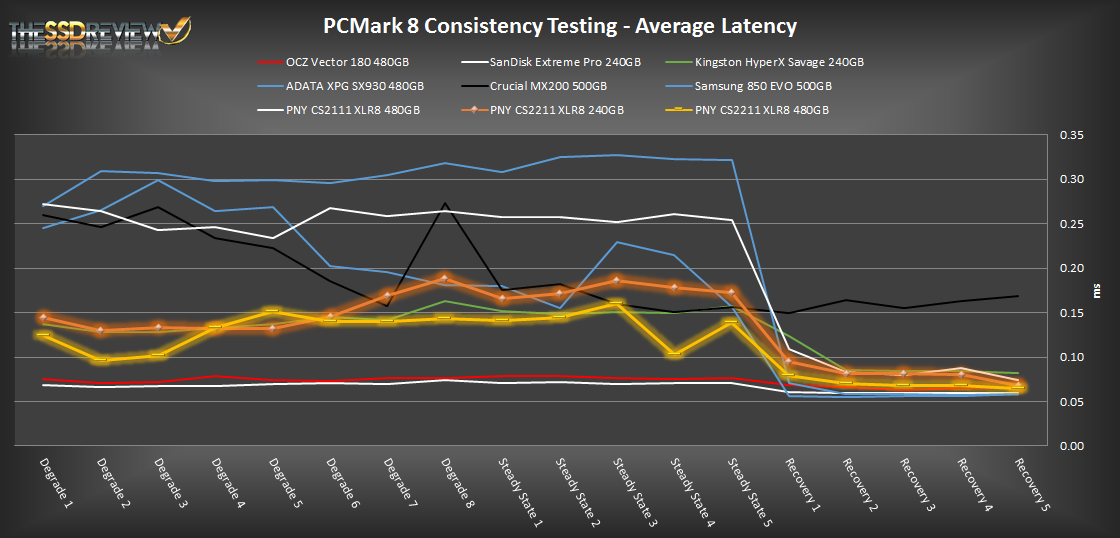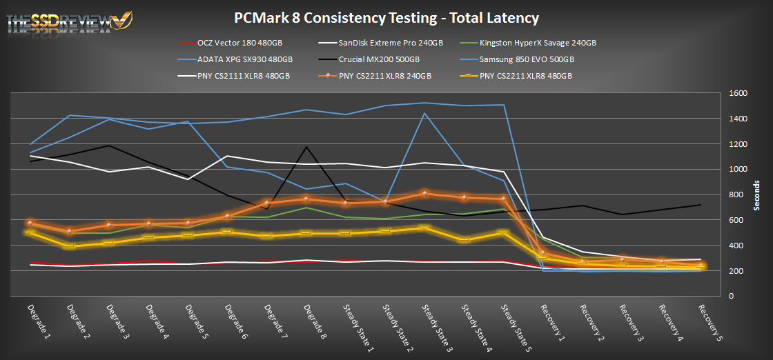 In our PCMark 8 consistency testing the PNY CS2211 SSDs do very well. As we can see, performance is on par or even better than some of the popular mid-tier SSDs. Under heavy workloads it does well, consistency is much better than most other options, but it still cannot compete with the SanDisk Extreme Pro or OCZ Vector 180. When it comes to light workload performance in the recovery phase we can see that its performance keeps it in the ranks of other mid-tier SSDs again. What we find interesting is that this drive edges out head of the Kingston HyperX Savage by about 40MB/s during the final phases and has slightly better latency results with this newer and smaller nm NAND.