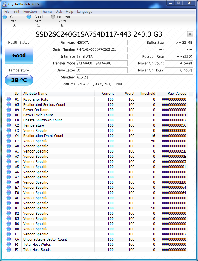When taking a look at Crystal Disk Info, we can see that the PNY OPTIMA SSD features the S.M.A.R.T. attribute, which allows for us to monitor the health of the SSD over its lifespean, as well as TRIM.