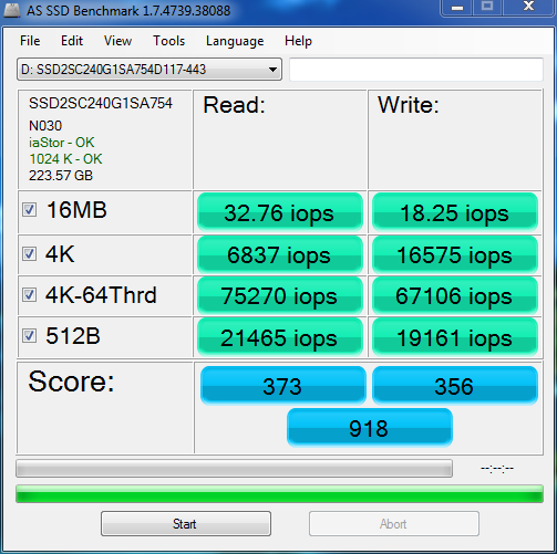 AS SSD Benchmark uses incompressible data in their testing of SSDs, essentially providing results that would be consistent with using the heaviest workload, thus lower speeds are expected. Transfer speeds (MB/s) are seen in the left picture below and IOPS (Input/Output Operations Per Second) are on the right.