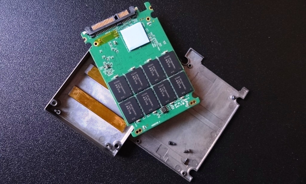 Once opened, a thermal pad is observed covering the SSD controller as well as two other metal bars that match perfectly to the memory on the printed circuit board (PCB).