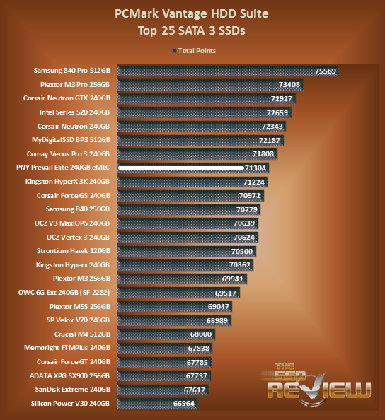 Our PCMark Vantage Hierarchy Chart places SATA 3 SSDs tested in order of their HDD Suite Total Score and it merits mentioning that no other benchmark programs calculated into SSD placement in this chart.