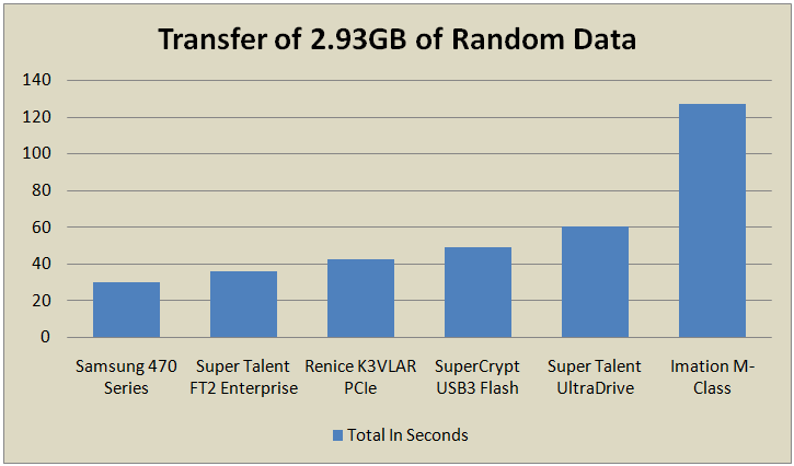 This was a simple real life test where 2.93GB of data was placed onto the test drive and then moved onto a different part of the drive to test the transfer max of that drive, given the composition of the data. The data was random and consisted of everything from zip files to music, movies, small OS applications and just about anything we could throw in there. Look closely and you will see, not only SSDs but also, a Mini-PCIe and a USB Flash Drive!!