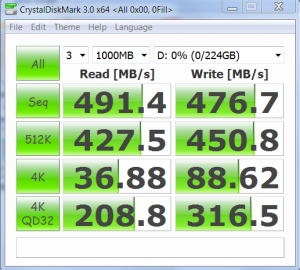 The AS SSD Copy Bench is one of the more ‘reality based’ tests found and simply creates three files, an ISO, program and game, and moves them from one part of the SSD to another. The resulting display shows the maximum transfer speeds of each copy operation along with time to move the files. This is very strong result, especially the first transfer which completed in just under three seconds with a transfer speed of 427MB/s.