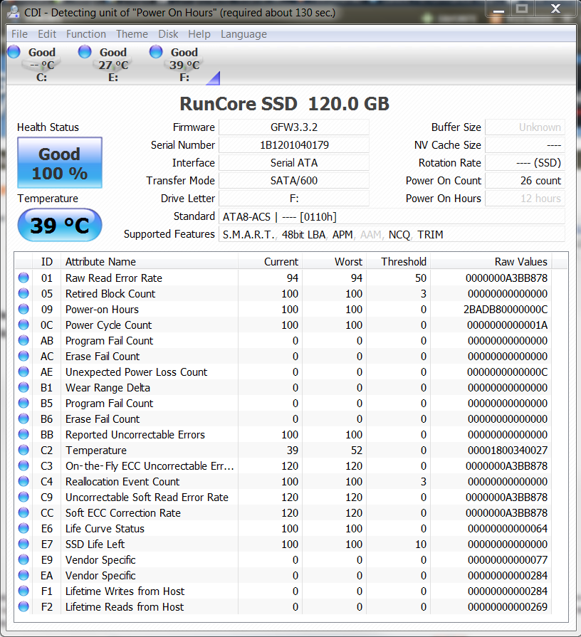 Crystal Disk Info provides some excellent information about the SSD itself to include its health, product information, power on information as well as the characteristics of the SSD. We can see that the SSD is capable of TRIM as it is not greyed out as with AAM.