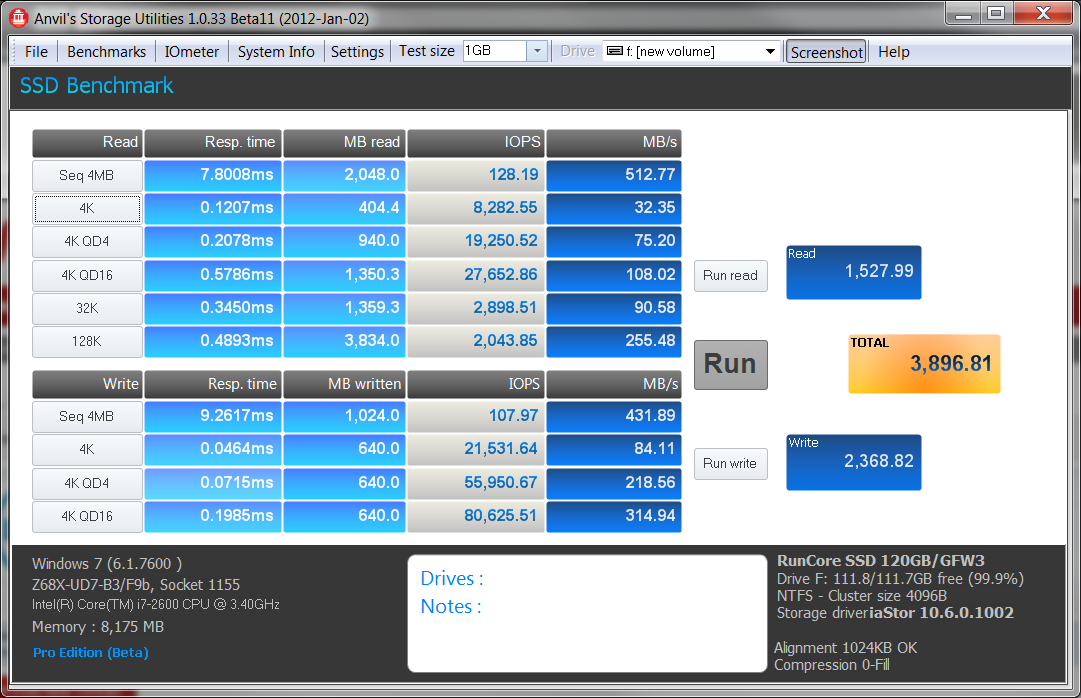 Over the last little while, we have been assisting with beta testing new benchmark software called Anvil Storage Utilities which is an absolutely amazing SSD benchmarking utility. Not only does it have a preset SSD benchmark, but also, it has included such things as endurance testing and threaded I/O read, write and mixed tests, all of which are very simple to understand and utilize in our benchmark testing.