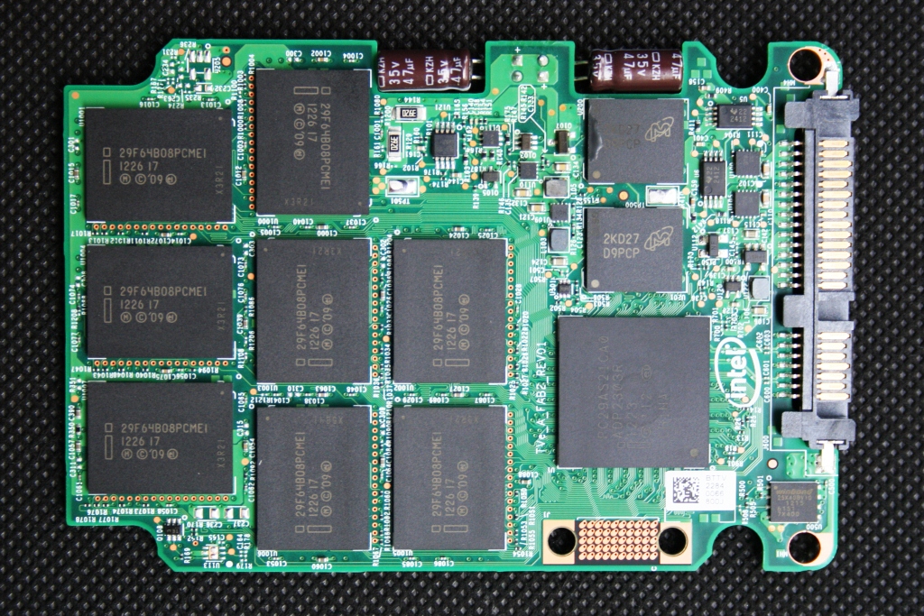 The 800GB model pictured here possesses a whopping sixteen 64GB packages. Each side holds eight 29F64B08PCMEI 25nm HET-MLC emplacements, with each octal-die package consisting of eight 64gbit dice. Do the math, and you get 8GB per die, 8 die per package, and 16 packages for 1024GB of NAND. It isn’t clear how the total amount of flash is being utilized, but Intel informed us that over-provisioning was around 20%. 745GB of user addressable space is available on the 800GB, which would point to 28% OP, but surely some of that flash is being used for other purposes.