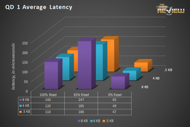 To specifically measure latency, we use a series of 512b, 4K, and 8K measurements. At each blocksize, latency is measured for 100% read, 65% read/35% write, and 100% write/0% read mixes.