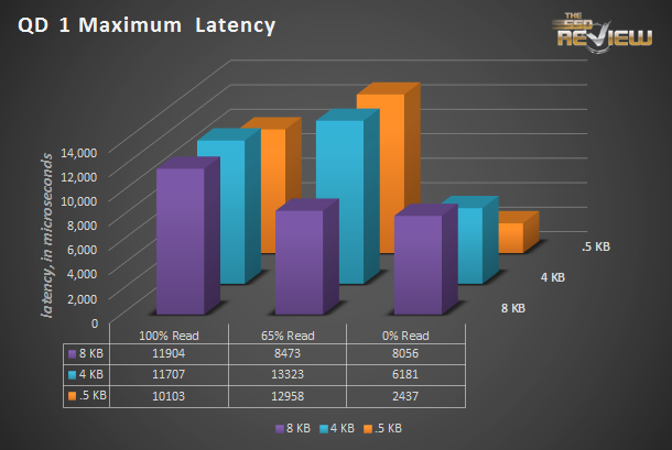 Maximum latency measurements at QD 1 are a sort of worst case scenario. These metrics represent the slowest IO among all the transactions. 99.95% of all IOs will complete far closer to the average than the max. Fewer than one out of every thousand IOs will take anywhere near the max numbers above to complete.