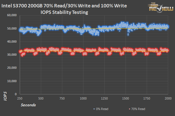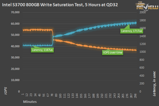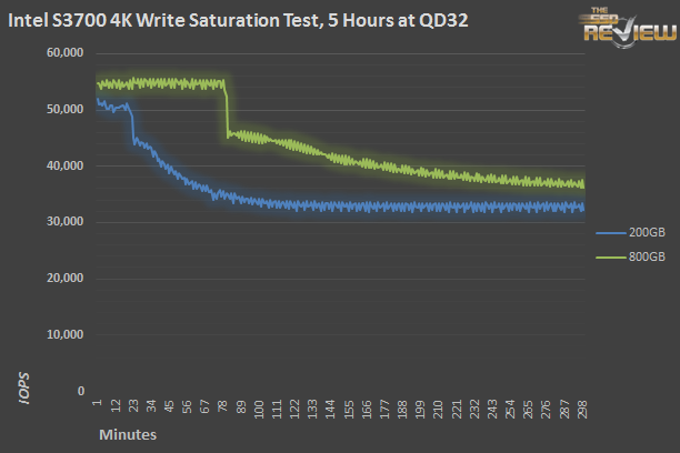Once both drives are crammed to the brim with data, the 800GB manages a steady 36,000 IOPS while the smaller S3700 hangs in at 32,000 IOPS. That’s spot on with Intel’s specifications which trade off the higher fresh-out-of-the-box numbers for persistent performance numbers. That the 200GB fills much more quickly isn’t relevant; a few hours after deployment, all drives will settle into steady state. It is inevitable.