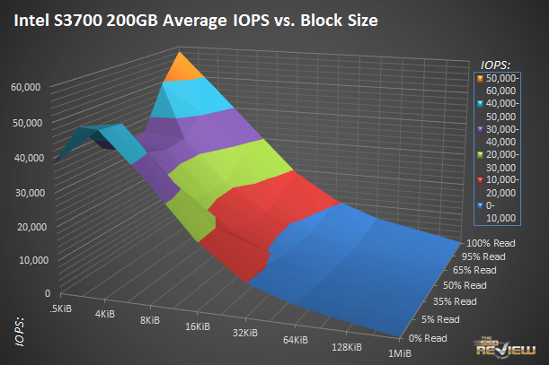 This is the same chart as above, but rendered in a surface chart and not a column. Its great for getting a feel for strengths and weaknesses, and for nearly all drives, reads are prominent. Going towards the back-left corner, IOPS increase. Head towards the bottom right, and IOPS diminish greatly. If we were to show this graph in terms of MB/s and not IOPS though, it would look much flatter.