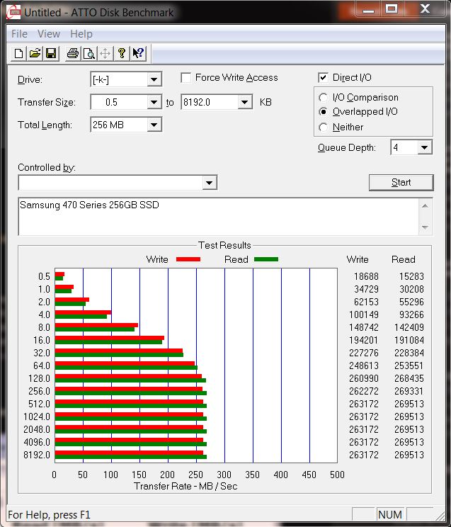 This test of the Samsung 470 Series 256 GB SSD is the best score we have seen out of a drive yet, given consideration to the sample method used (random) and disk access methods tested in Crystal. To add to this, their specifications detail read/write performance of 250MB/s and 220MB/s which is not even close to what we have achieved (Look Up). Quite frankly, it is an amazing score and the 4kb random write alone is a huge jump from the former Samsung offering.