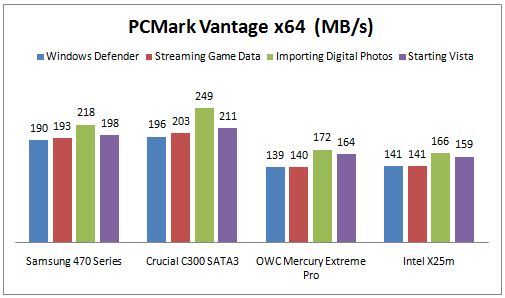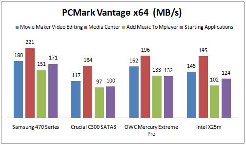 We left the best for last with respect to testing and one will soon see why. The SSD Review uses benchmark software called PCMark Vantage x64 HDD Suite to create testing scenarios that might be used in the typical user experience. There are eight tests in all and the tests performed record the speed of data movement in MB/s to which they are then given a numerical score after all of the tests are complete. The simulations are as follows:.