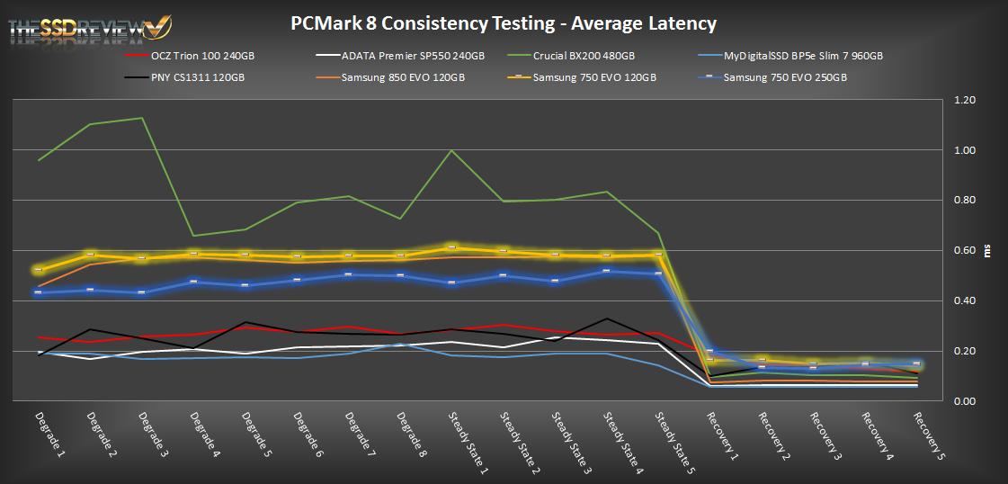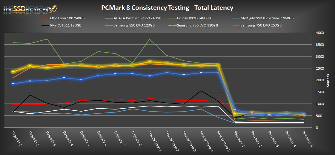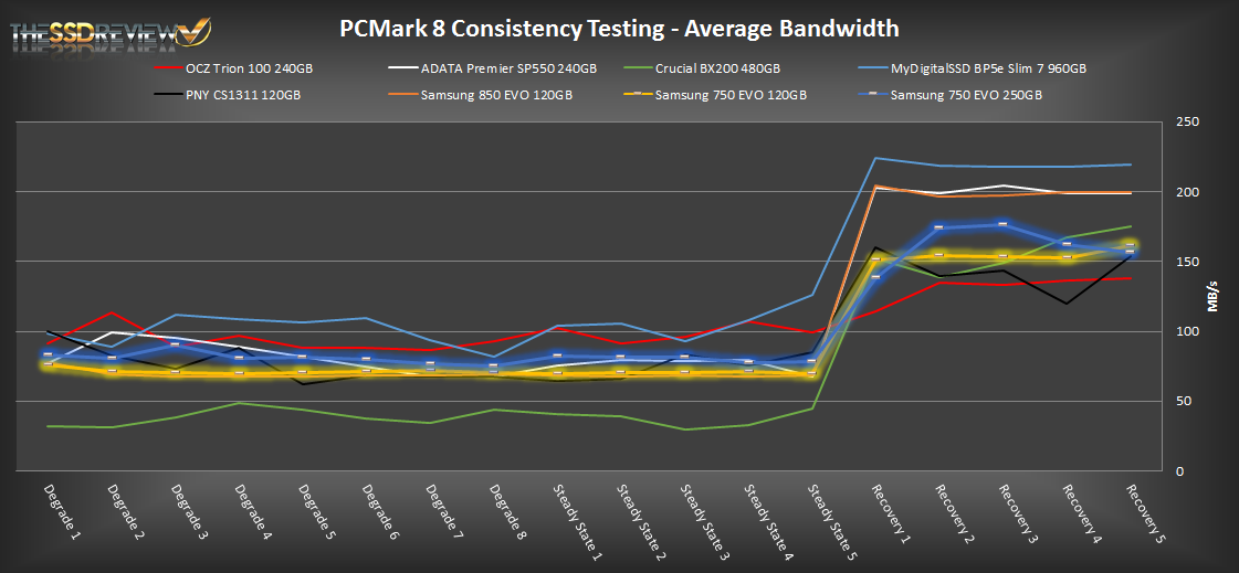In reading the results, the Degrade and Steady State phases represent heavy workload testing while the recovery phase represents typical consumer light workload testing.