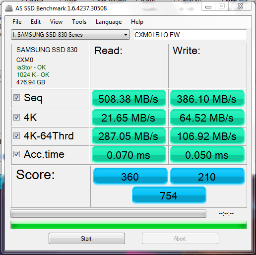 AS SSD averages results, and does more intensive testing of 4K randoms than CDM. This bench does generate lower 4K scores than CDM, but are closer to speeds which might be realized in actual usage. As a result, the 64.52MB/s achieved in the QD1 4K write category is most pleasing, even though it’s half of the CrystalDisk score. AS SSD also records access times, which are arguably more important. The Samsung does quite well there, too, on par with it’s Marvell-powered peers and ahead of most SF drives.