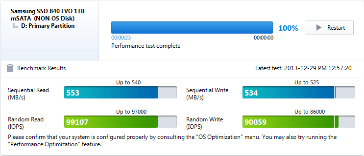 The Samsung 840 EVO mSATA SSD provided very impressive results in Vantage testing with a high Total Score of 75212 and top transfer speed of 415MB/s while testing in Windows Media Center. Equally impressive was the fact that we had 7 of 8 results reach SATA 3 speeds, two of which were above 400MB/s. Checking our original review of the Samsung 840 EVO 1TB SSD notebook form factor, results between the two are very similar.
