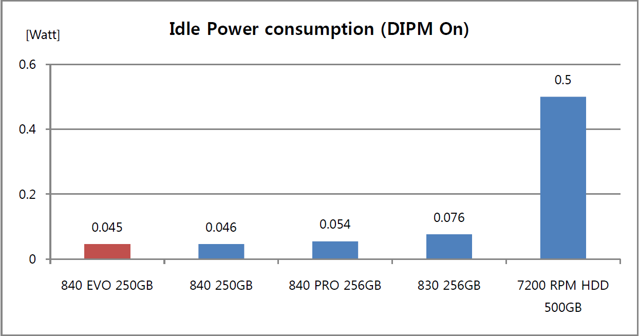 Power management of SSDs seems to be of interest to many consumers as of late and Samsung has done their best to ensure great battery life through a typical power rating of 11mW and idle at 45mW for the 840 EVO. Considering that laptop SSDs are idle for 95% of the time, idle power consumption is key as it, not only extends battery life but also, reduces heat as well. In idle time, the Samsung 840 EVO uses 11 times less power than a hard drive.