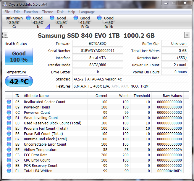 Crystal Disk Info provides some excellent information about the SSD itself to include its health, product information, ‘power on’ information as well as the characteristics of the SSD. We can see that the SSD is capable of TRIM as it is not greyed out as with AAM.