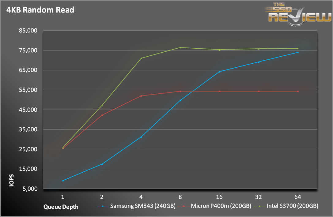 The SM843 showed really consistent write performance at all queue depths. It was a little surprising that the SM843 struggled at lower queue depths for read operations. It took a queue depth of 64 for the SM843 to catch up with the S3700.