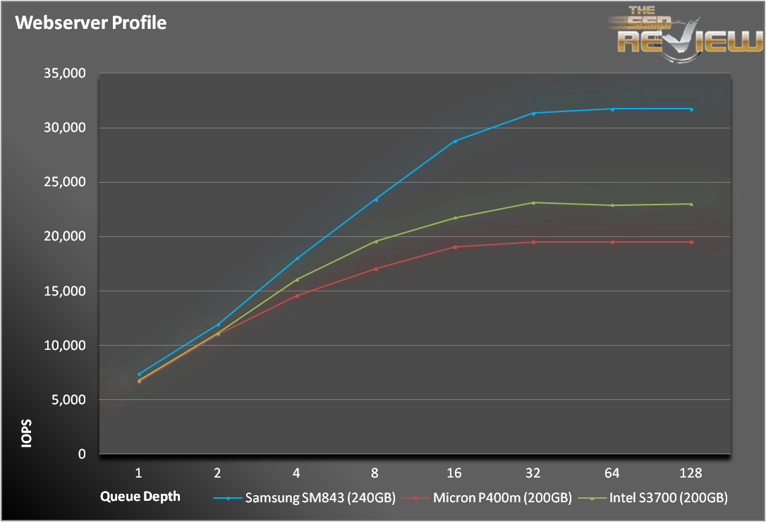 Well, that’s more like it. When we switch to our webserver profile, which is 100% reads, the SM843 pulls ahead of the pack. I guess we shouldn’t be completely surprised, one of the target applications that Samsung specifically called out was webserver.