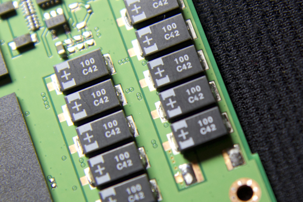 This is exactly what the SM843 was missing. Across the top of the circuit board we have multiple rows of capacitors. In the event of sudden power loss, these capacitors will keep the drive going long enough to commit all data from the write cache to NAND.