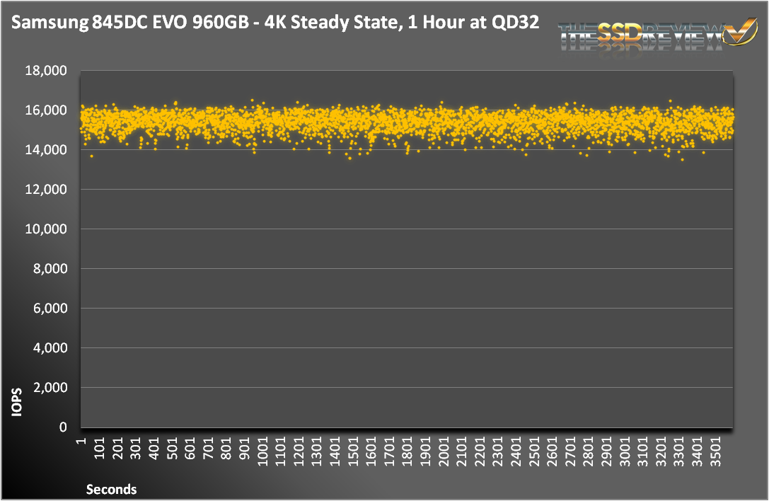 Looking at 1 minute averages, the 845DC is absolutely rock solid. Not only did we see almost no deviation, the average was close to 15K IOPS, which is higher than the 14K IOPS specification.