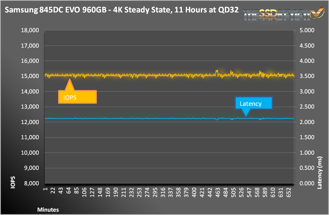As we talked about in our Micron P400m SSD Review, SSDs have different performance states. Since the Samsung 845DC EVO is an enterprise SSD, we will focus on steady state performance. With the following tests, we stressed the drive using random 4KB write workloads across the entire span for at least 24 hours. This is more than enough to achieve steady state. The following graph is showing the latency and IOPS across an 11 hour span.