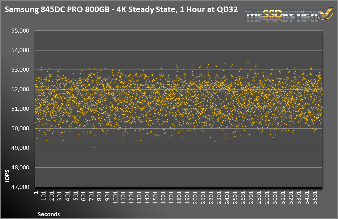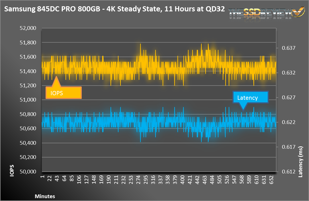 These were the sort of results that we were hoping for. Not only did we blow by the 50K IOPS number from the datasheet, the 845DC PRO did it consistently. In our per minute average, we did not see more than a 500 IOPS swing across 11 hours.
