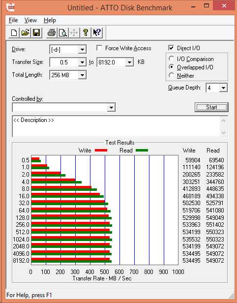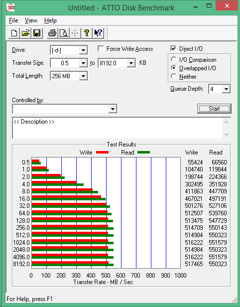 ATTO Disk Benchmark is perhaps one of the oldest benchmarks going and is definitely the main staple for manufacturer performance specifications. ATTO uses RAW or compressible data and, for our benchmarks, we use a set length of 256mb and test both the read and write performance of various transfer sizes ranging from 0.5 to 8192kb. Manufacturers prefer this method of testing as it deals with raw (compressible) data rather than random (includes incompressible data) which, although more realistic, results in lower performance results.