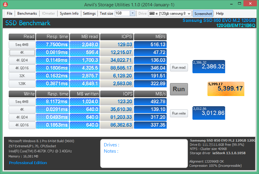 Anvil’s Storage Utilities (ASU) are the most complete test bed available for the solid state drive today. The benchmark displays test results for, not only throughput but also, IOPS and Disk Access Times. Not only does it have a preset SSD benchmark, but also, it has included such things as endurance testing and threaded I/O read, write and mixed tests, all of which are very simple to understand and use in our benchmark testing.