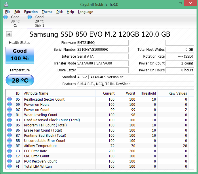 Crystal Disk Info is a great tool for displaying the characteristics and health of storage devices. It displays everything from temperatures, to the number of hours the device has been powered, and even to the extent of informing you of the firmware of the device.