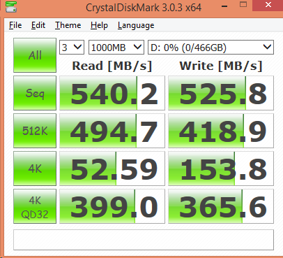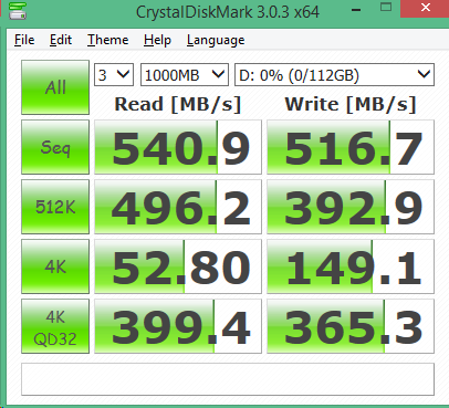 Crystal Disk Mark shows us sequential read speeds closer to the rated speeds of the SSD at 541MB/s for the 120GB and 540MB/s for the 500GB. Furthermore, the sequential write was still considerably above the rated at 517MB/s for the 120GB and 526MB/s for the 500GB. As for the 4K speeds, the 120GB comes in at 52MB/s read and 149MB/s write and the 500GB reached 53MB/s read and 153MB/s write. Both 4K read and write performance are very strong.