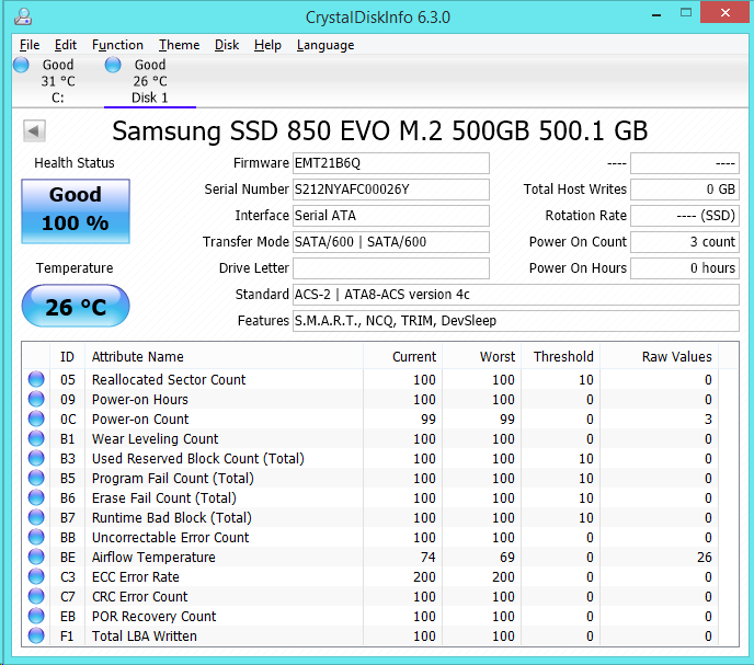 Crystal Disk Info shows us that the Samsung 850 EVO SSD’s S.M.A.R.T. data feature a working temperature attribute as well as many others to monitor the health of the SSD over its lifespan. It also shows us that it supports TRIM and DevSleep.
