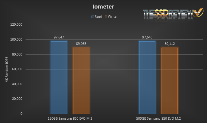 Since there were some inconsistencies with the rated IOPS from the other benchmark programs, we went to Iometer to settle the divided results. We ran 4K random read and write workloads at QD32 for 30 seconds and as result here are the averages. As you can see both capacities meet their IOPS ratings.