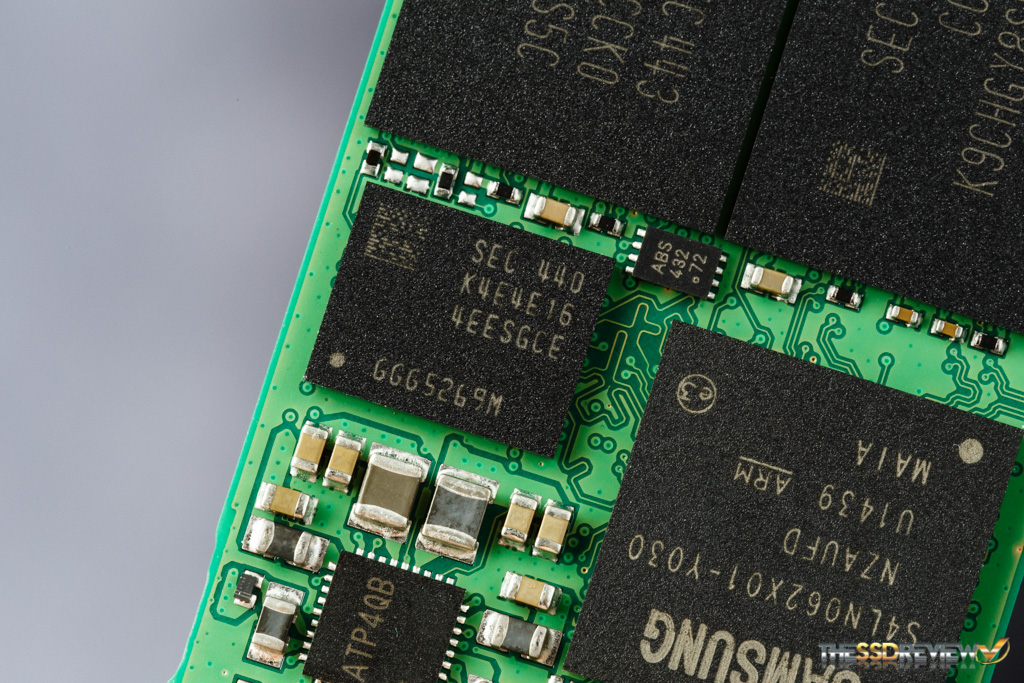 Looking at the image above to the left, we see the 3D V-NAND chips of the 120GB model, which are laser-stenciled as “SEC 443”. There are only two 64GB NAND packages on the PCB of the 120GB model. Once formatted there is 112GB of usable space. To the right we see the higher capacity 3D V-NAND chips of the 1TB model, which are laser-stenciled as “SEC 446”. There are four 256GB NAND packages on the PCB of this model and once formatted there is 931GB of usable space.