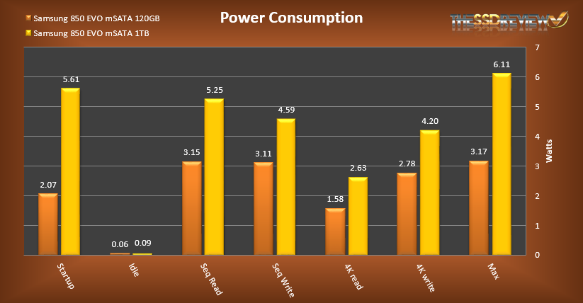 Not surprisingly, the 1TB mSATA 850 EVO draws a bit more power in all aspects of the testing than the 120GB version. At startup, the 1TB peaks briefly at 5.61w, while the 120GB peaks briefly at just over 2w. At idle, the 1TB was drawing .09w to the 120GB’s .06w. Sequential reads saw the 1TB drawing up to 5.25w, with the 120GB drawing up to 3.15w. Sequential writes indicated the 1TB drawing up to 4.59w, and the 120GB drawing up to 3.11w. 4K reads drew 2.63w with the 1TB, and 1.58w with the 120GB. 4K writes drew 4.20w with the 1TB, and 2.78w with the 120GB. And finally, the maximum measured power draw was 6.11w for the 1TB version, and 3.17w for the 120GB version. While the mSATA 850 EVO product page specifications only indicate average and maximum power draw (burst mode), our results fall within the stated ranges.