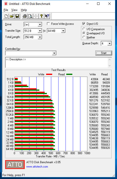ATTO Disk Benchmark is perhaps one of the oldest benchmarks going and is definitely the main staple for manufacturer performance specifications. ATTO uses RAW or compressible data and, for our benchmarks, we use a set length of 256mb and test both the read and write performance of various transfer sizes ranging from 0.5 to 8192kb. Manufacturers prefer this method of testing as it deals with raw (compressible) data rather than random (includes incompressible data) which, although more realistic, results in lower performance results.